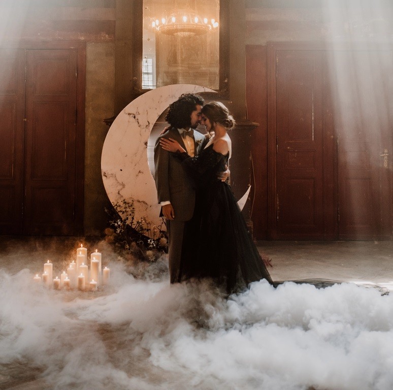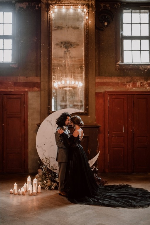 Das Planungs- und Designteam von marrybylen erklärt dazu: „Unsere erste Inspiration, als wir an dieses Editorial dachten, war dunkel + elegant! Im Gegensatz zu einem leichten + luftigen Look spiegelt dieser Stil einen emotionaleren Vibe wider – mit stimmungsvollen Farben und geheimnisvollem Funkeln. Um eine tiefere Hochzeitsstimmung zu erzielen, haben wir den Mond als Symbol mit eingebracht.“